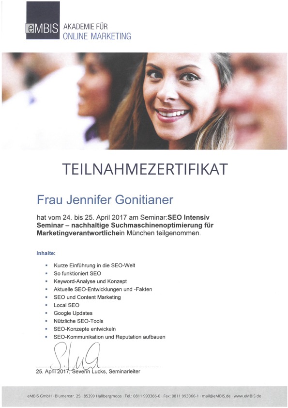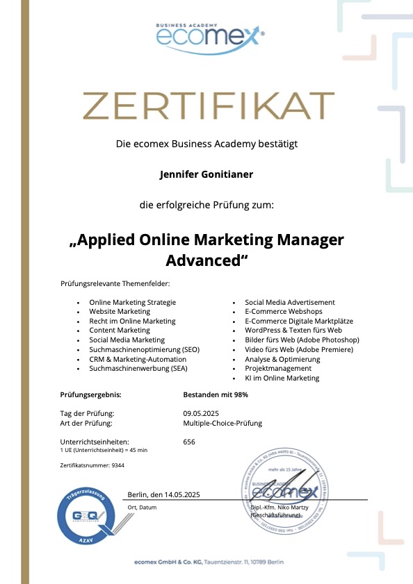 Um immer auf dem neuesten Stand zu bleiben, habe ich mein Wissen gezielt aufgefrischt und vertieft: von SEO-Optimierung bis hin zu den neuesten Entwicklungen im Bereich Social Media und Marketing-Automation.